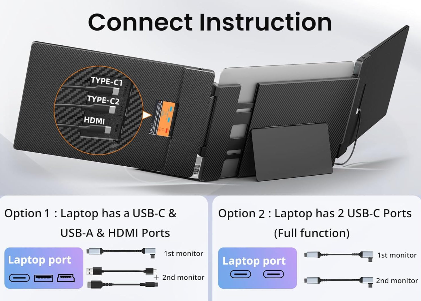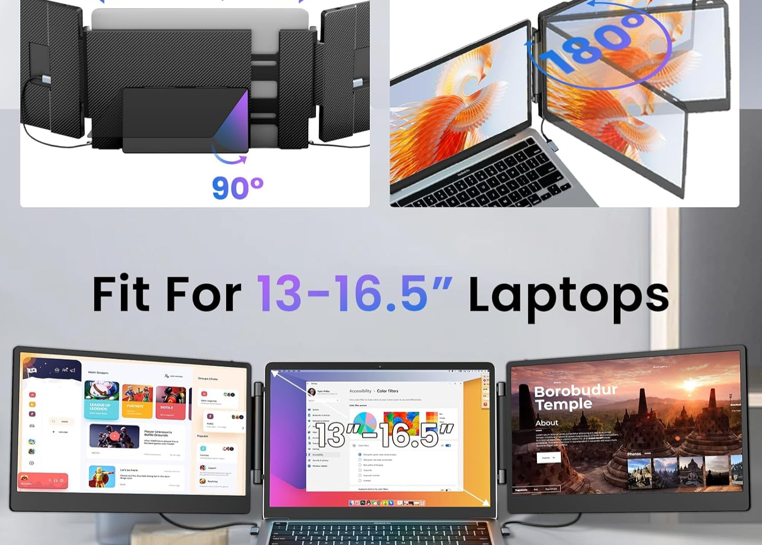💼 Portable & Easy to Use – Despite offering triple-screen functionality, TriView is surprisingly compact and travel-friendly. It folds neatly with your laptop and connects via USB-C or HDMI—no drivers, no tools, just plug-and-play convenience. Take your full workstation anywhere, from remote workspaces to business trips.